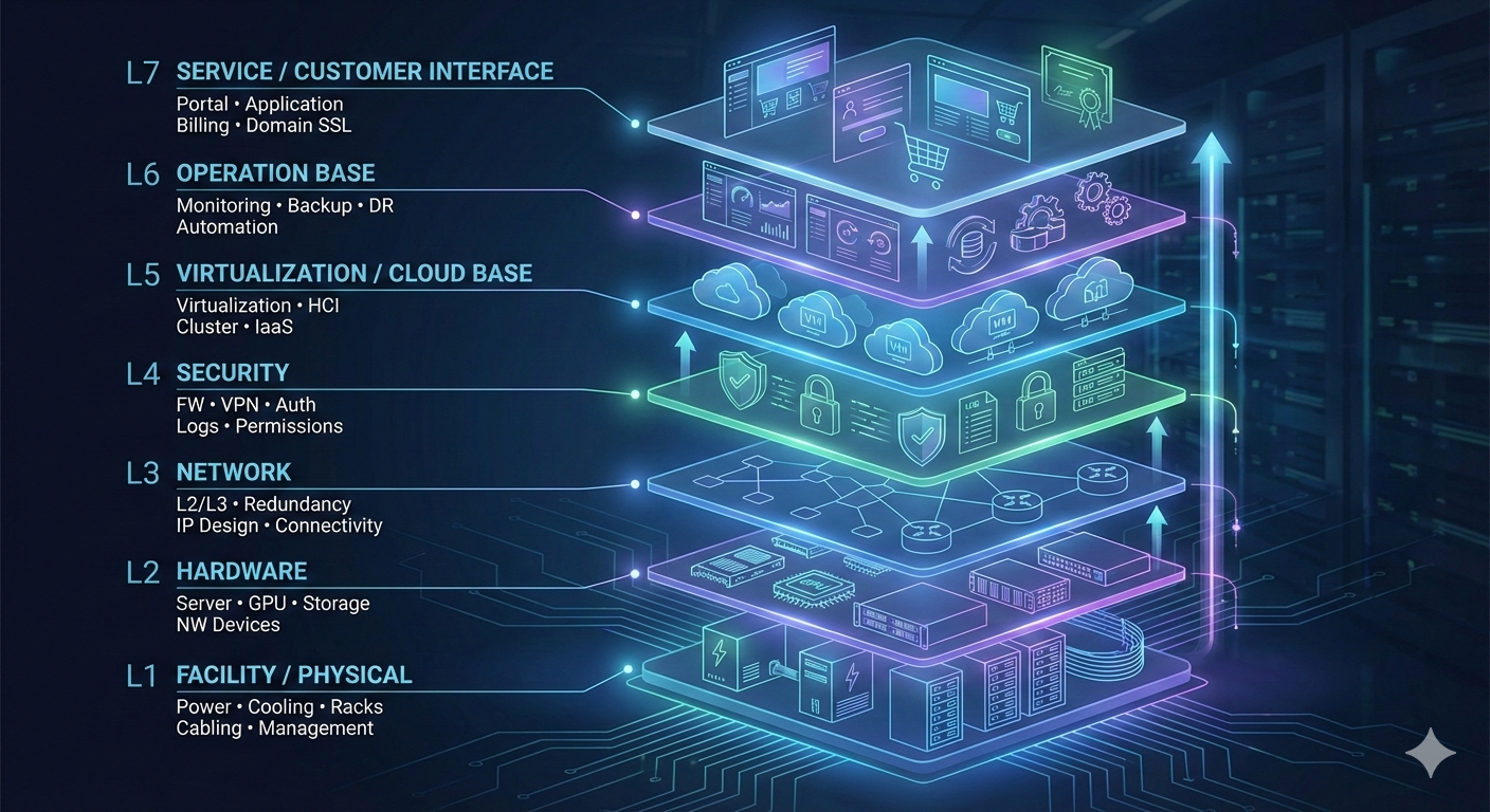 L1からL7まで分断しないインフラ設計。運用まで見据えたクラウドを。クラウド/VPS/GPU/ドメイン・SSLまで。サービス提供者の視点で、設計・運用を支えます。