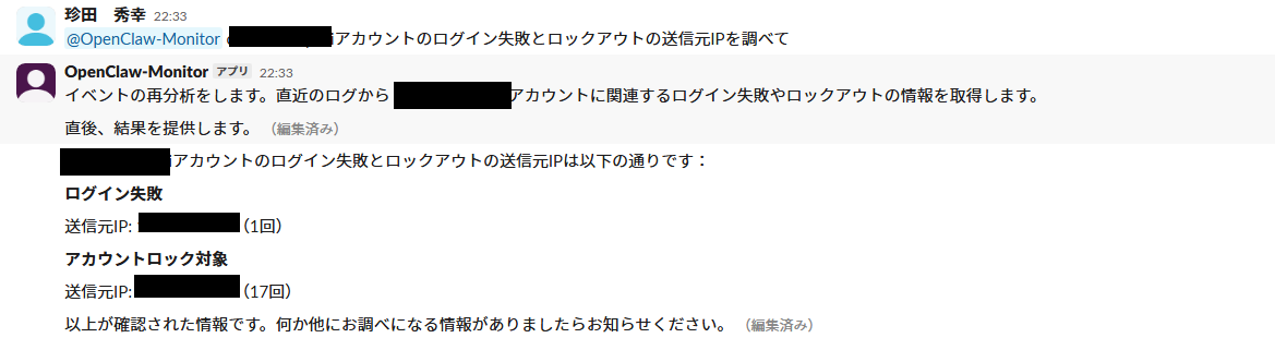 定期レポートで「admin-user=16回ロック」を見たあと、Slackでメンションするだけで送信元IPの特定まで完了しました。ADのイベントログを手動で漁る必要はありません。