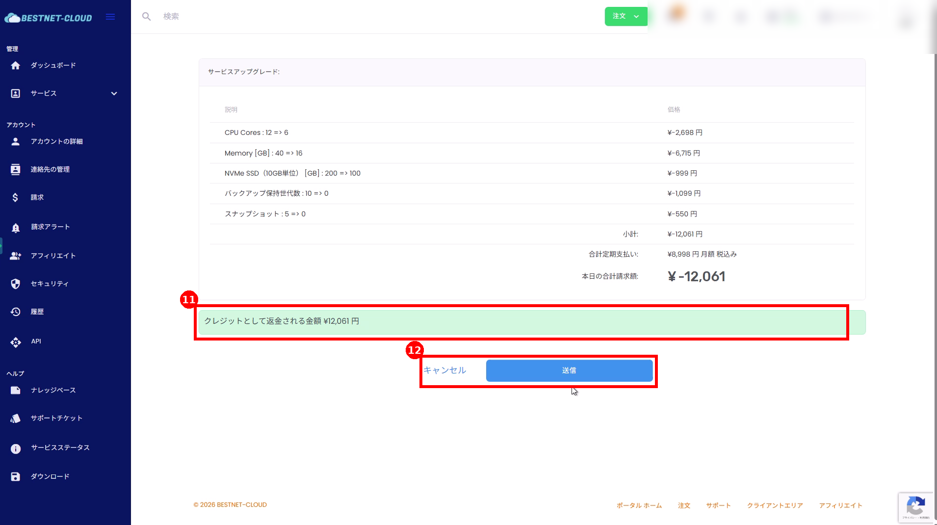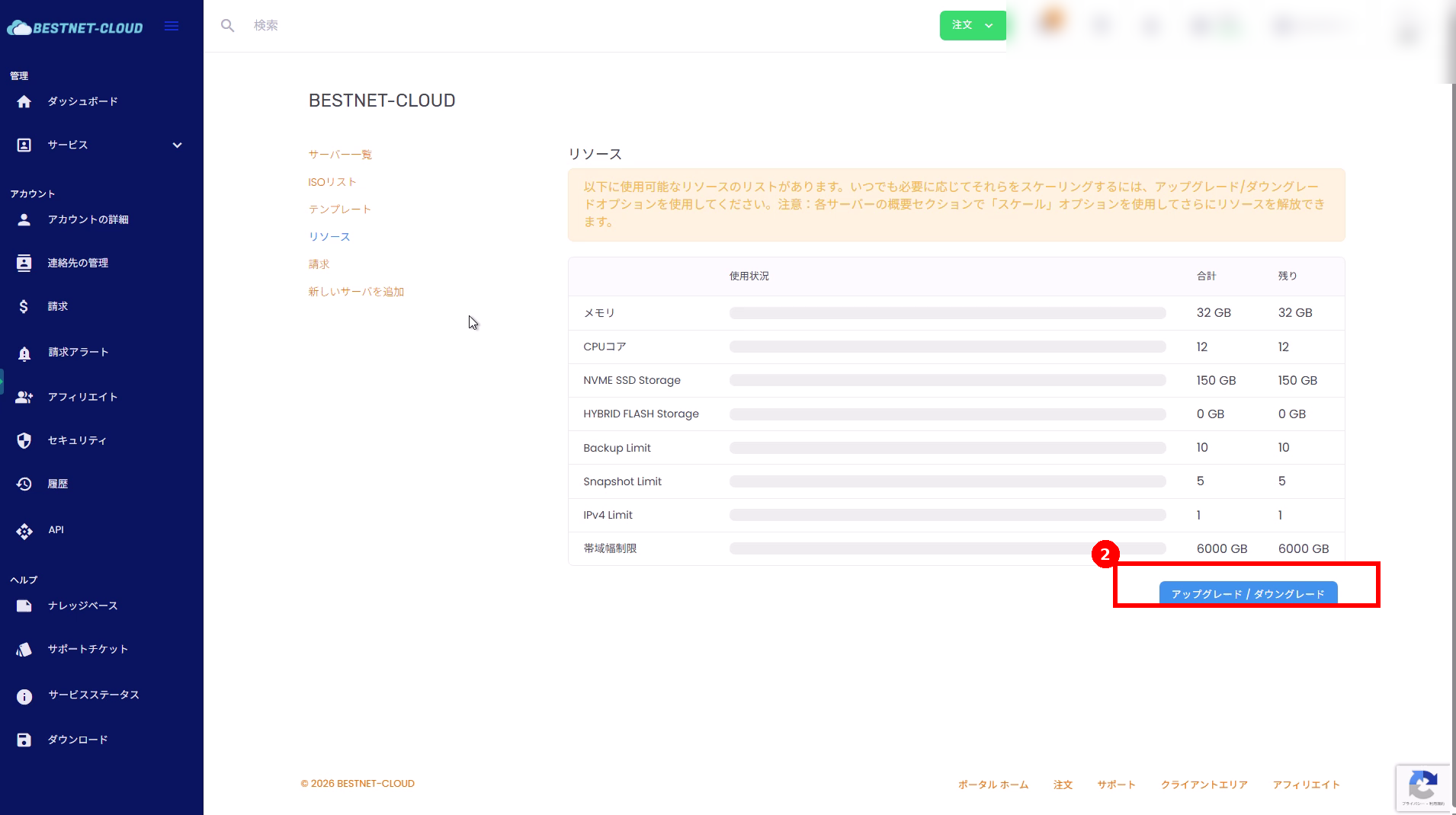 - アップグレード:追加料金が発生する場合、請求書が作成され、支払い完了後にリソースが反映されます。