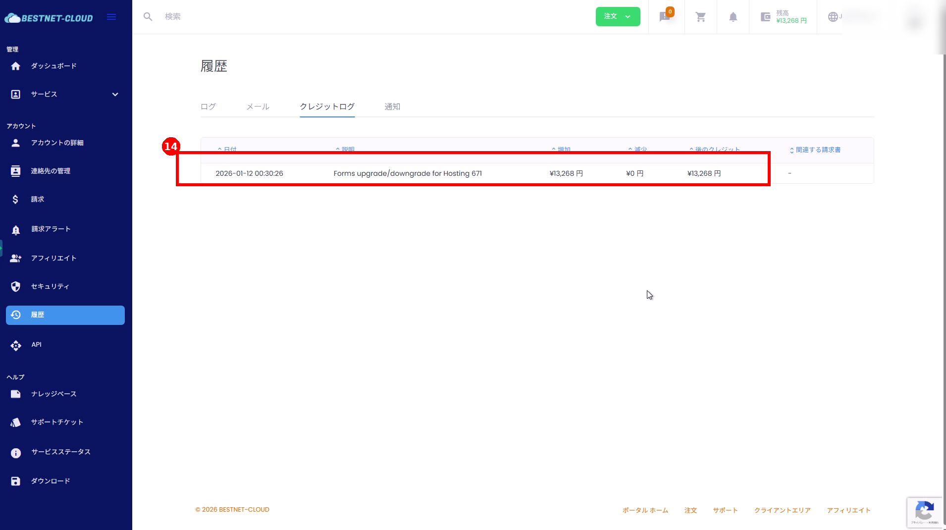 ダウングレード確定後、上部メニューなどに表示される「利用可能なクレジット」の増加、およびクレジットログへの記録を確認します。