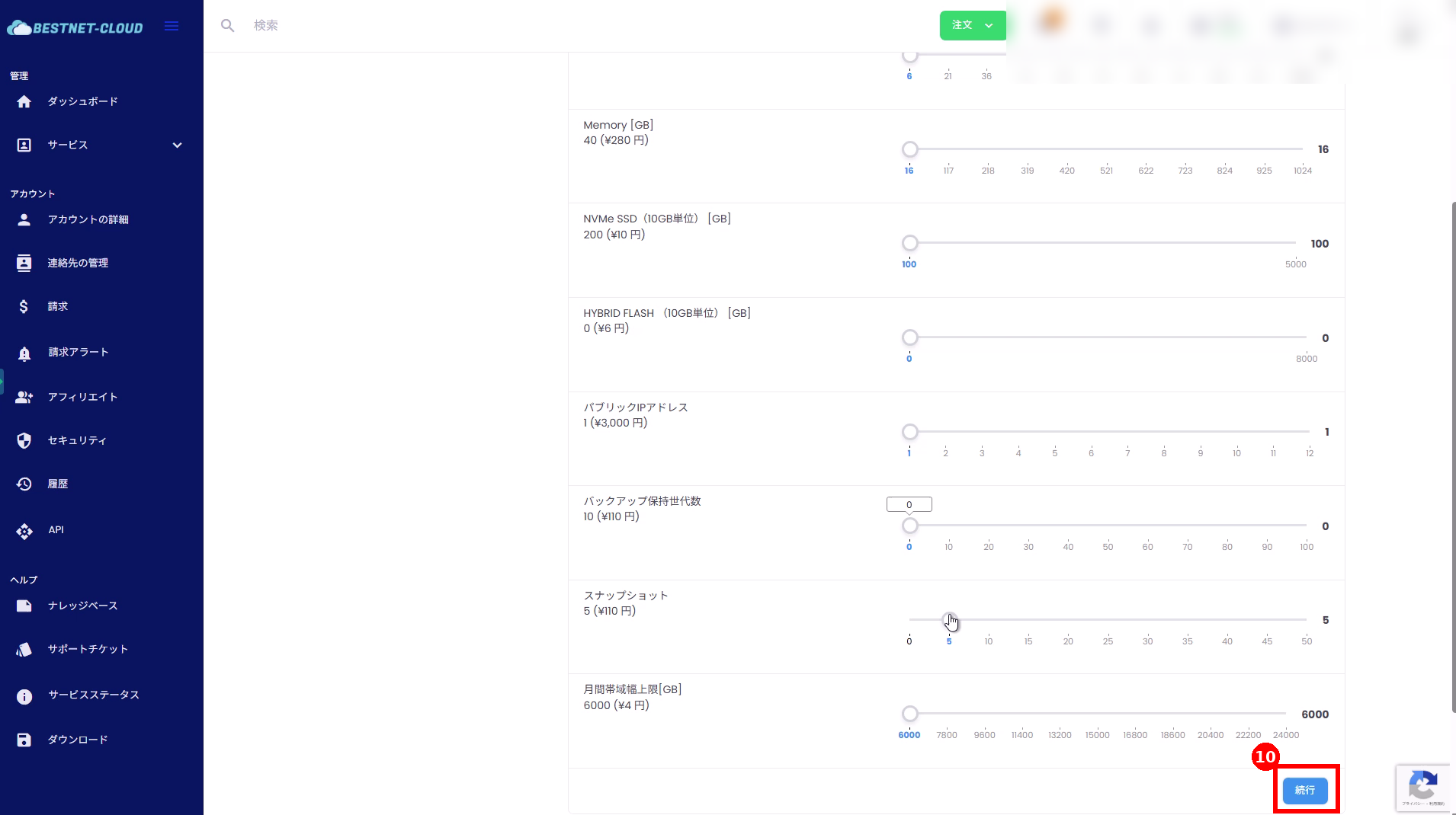 縮小したい項目(例:CPU、メモリ、NVMe SSD、バックアップ保持世代数、スナップショット上限など)を希望値に変更します。設定後、ページ下部の「続行」をクリックします。