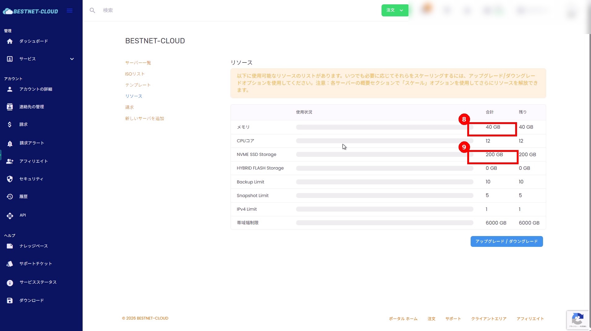 - アップグレード:追加料金が発生する場合、請求書が作成され、支払い完了後にリソースが反映されます。