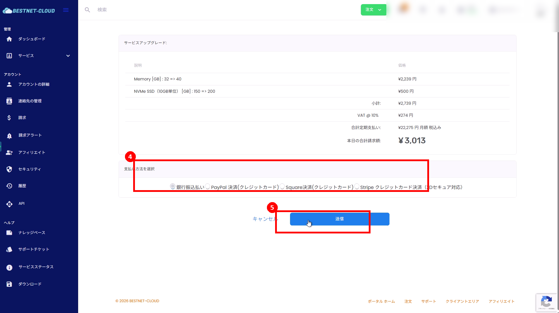 変更内容(増やした項目)と料金を確認します。支払い方法を選択し、「送信」をクリックしてアップグレードを確定します。