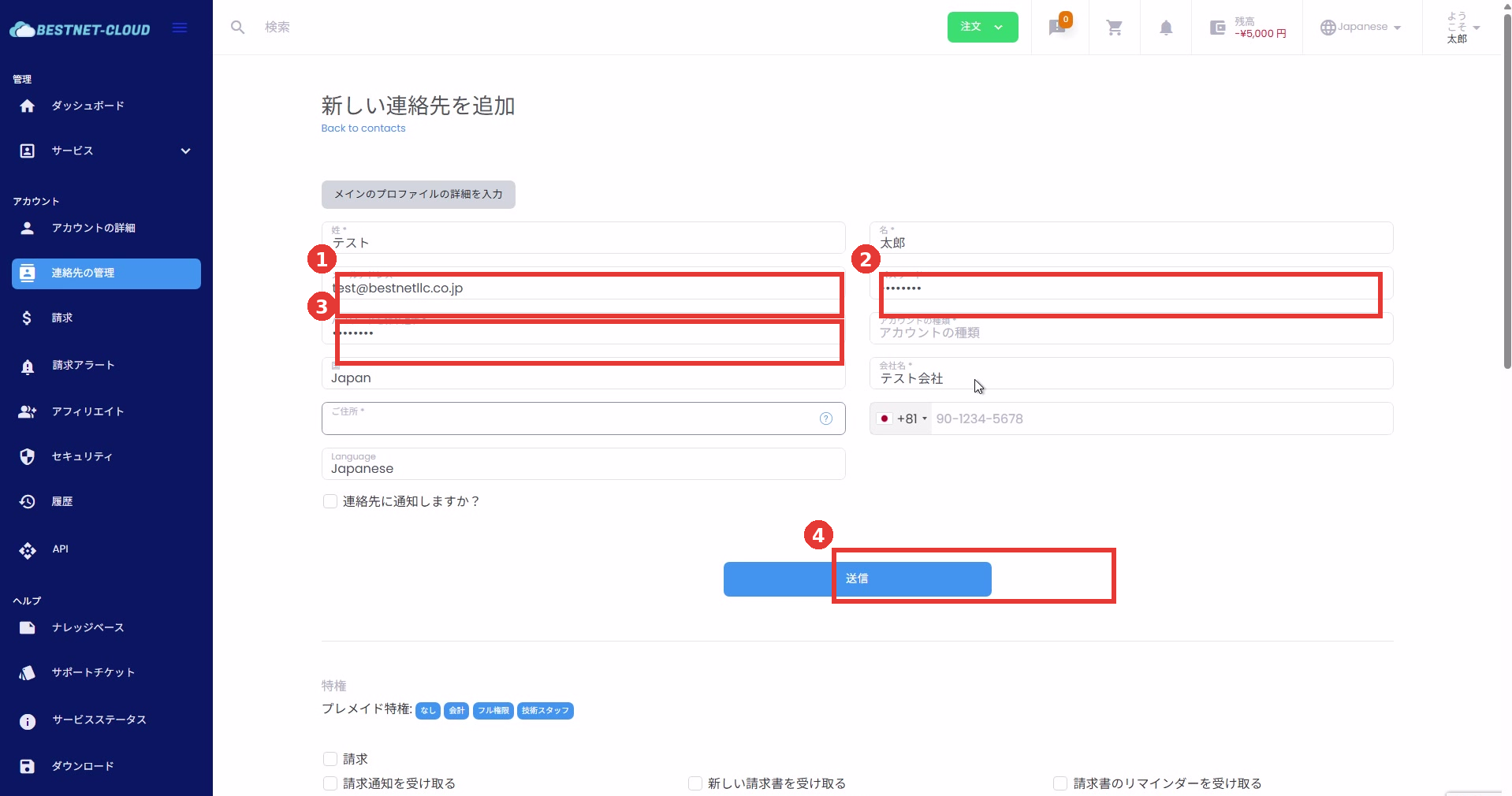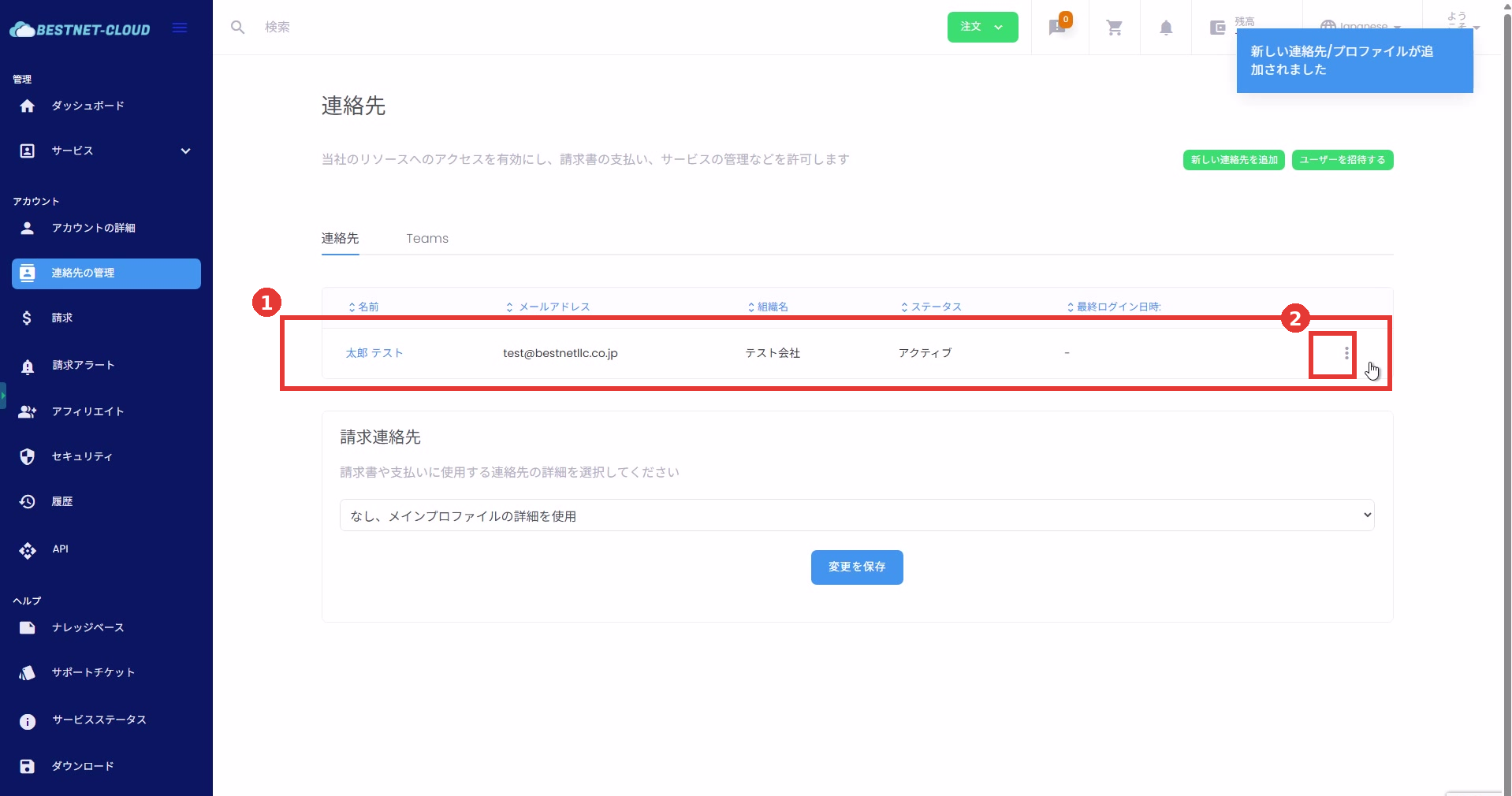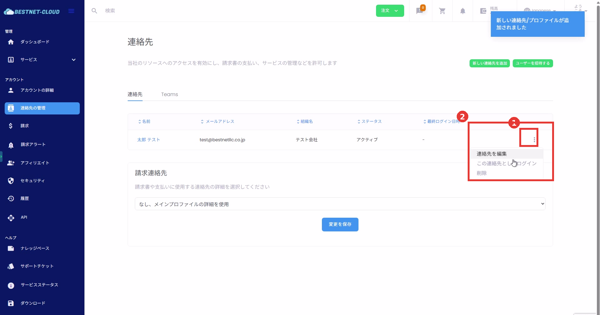 - 連絡先を編集:メールアドレス、パスワード、権限などを変更します。