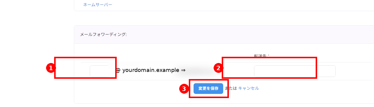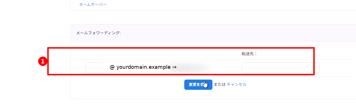 1. メールフォワーディング欄の入力行で、メールボックス名(@の左側)を入力します。