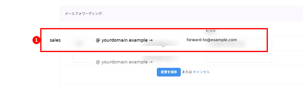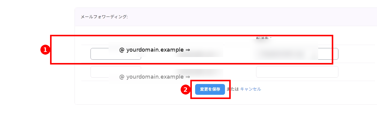 1. 削除したい転送設定の行で、メールボックス名(@の左側)転送先の入力を空欄にします。