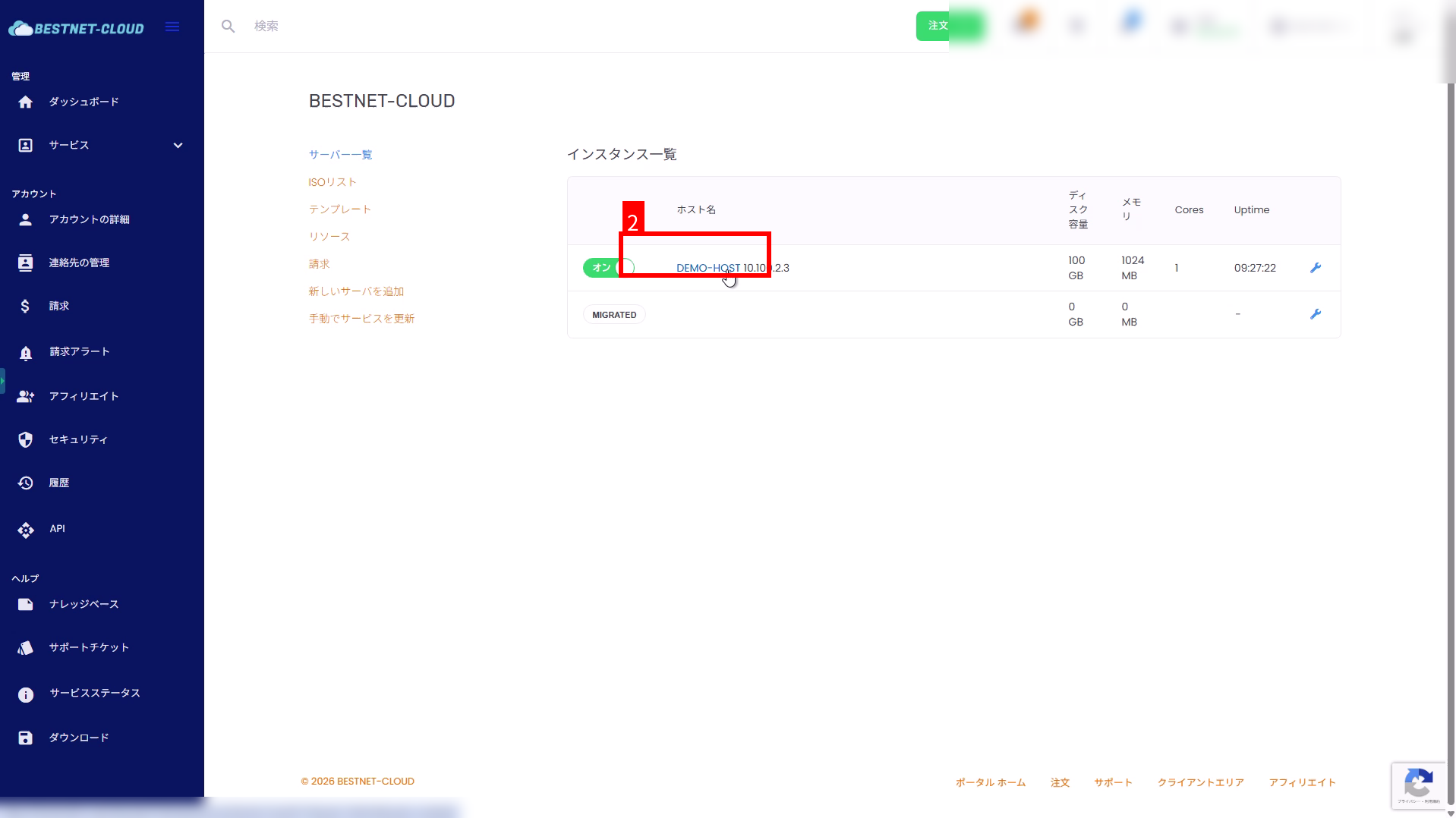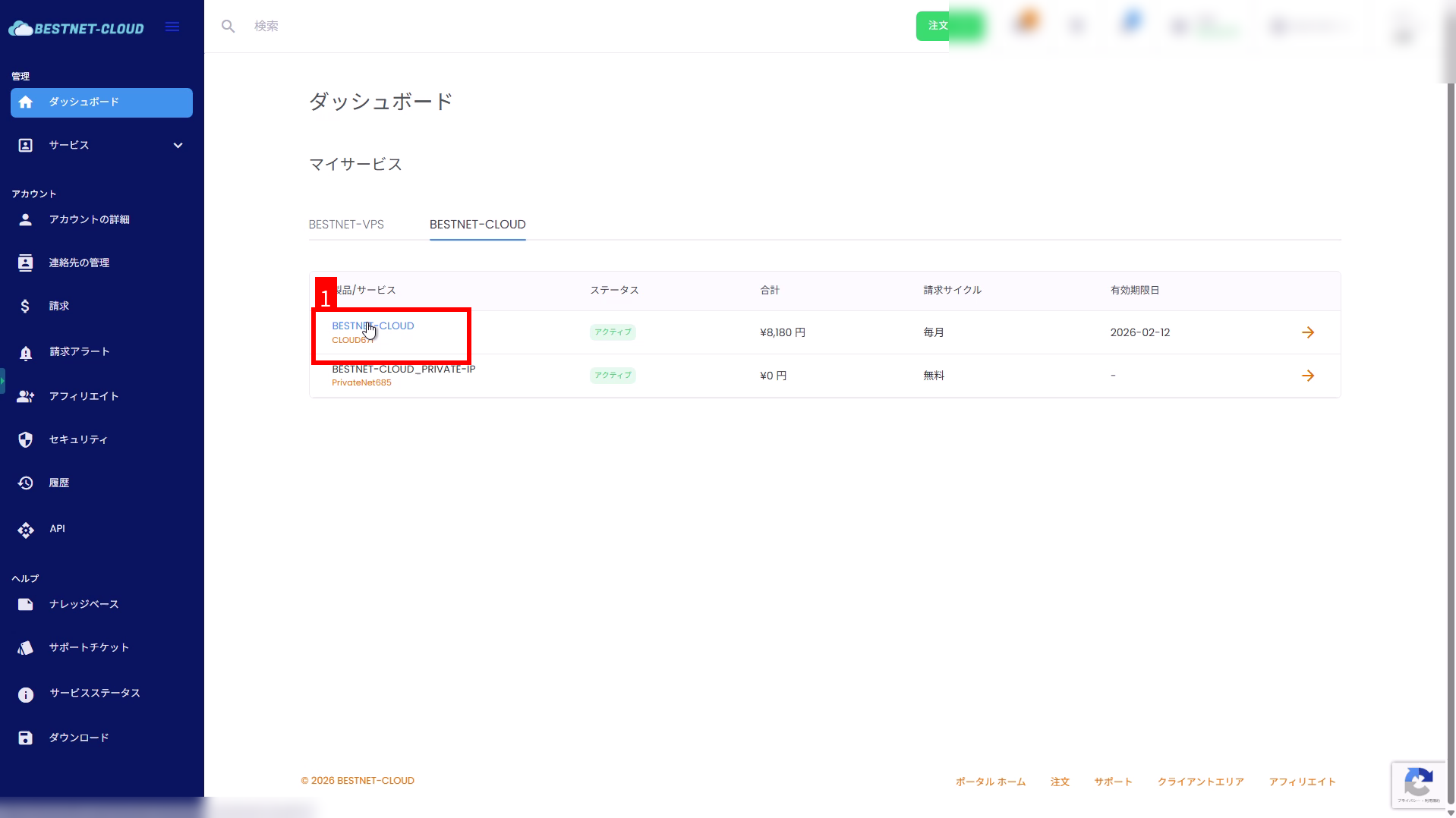 ダッシュボードの マイサービス から BESTNET-CLOUD をクリックしてサービス画面を開きます。