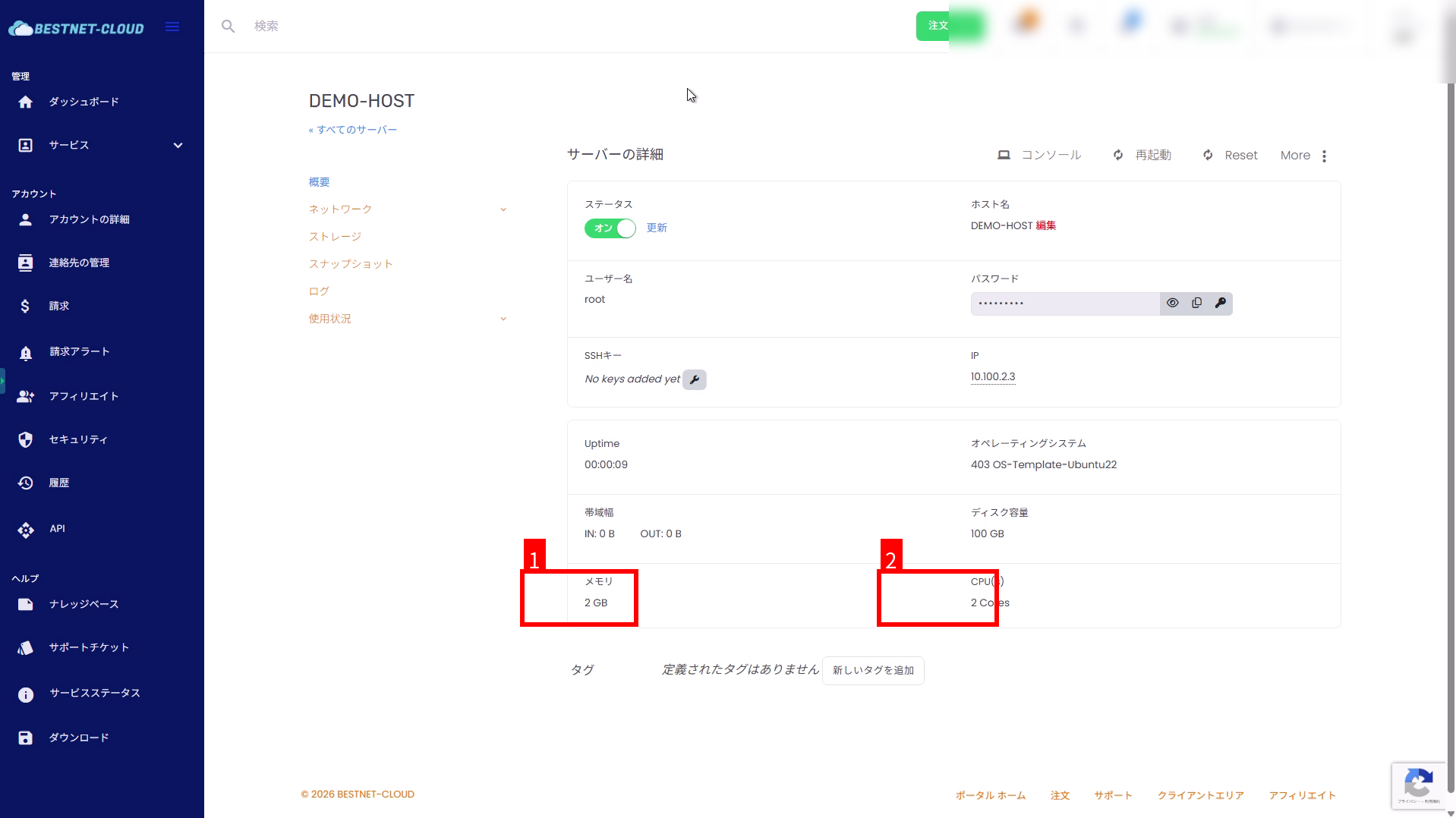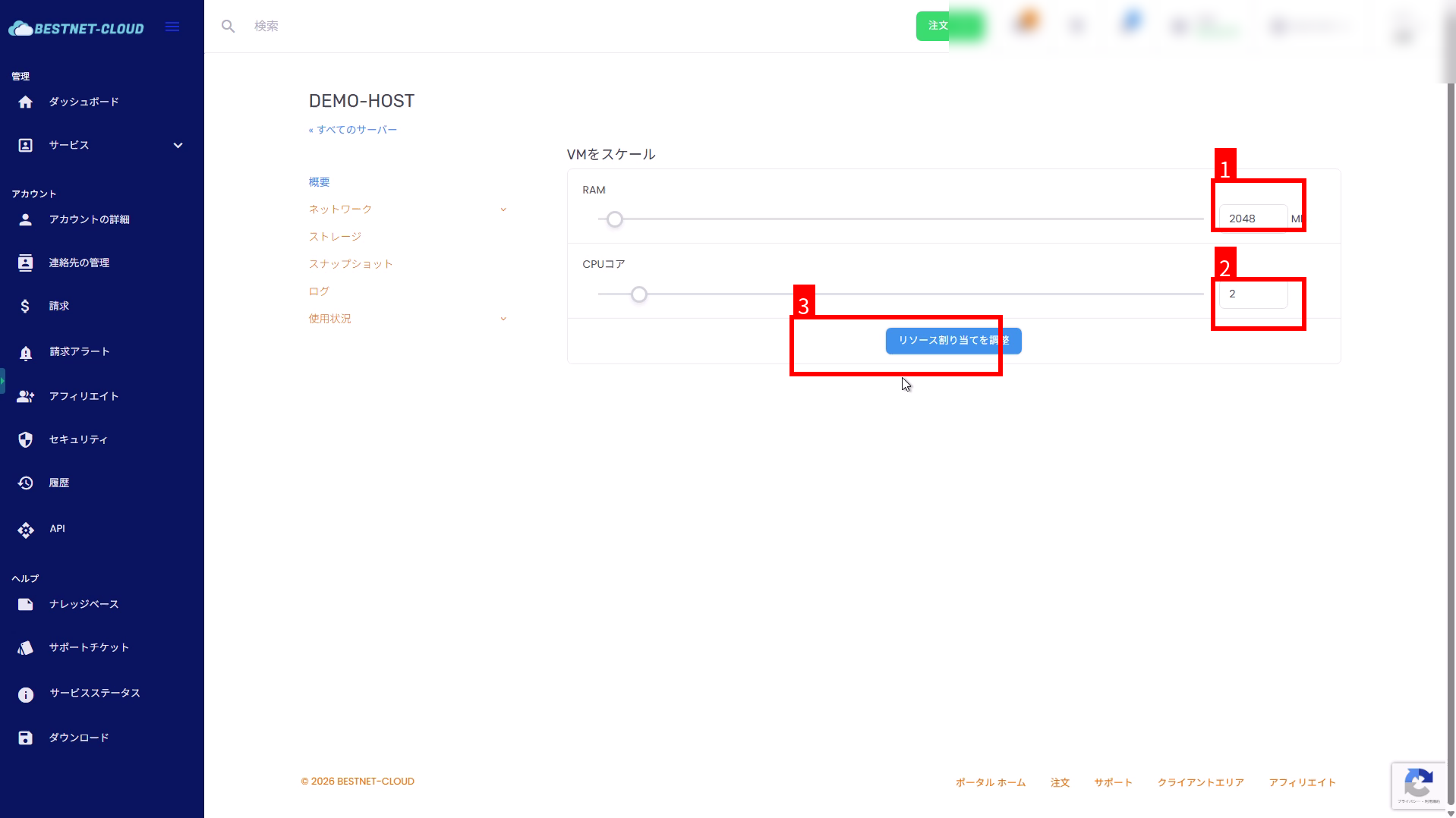 クライアントポータルから、クラウド仮想マシン(インスタンス)の CPUコア数 と メモリ(RAM) を変更(スケール)する手順です。