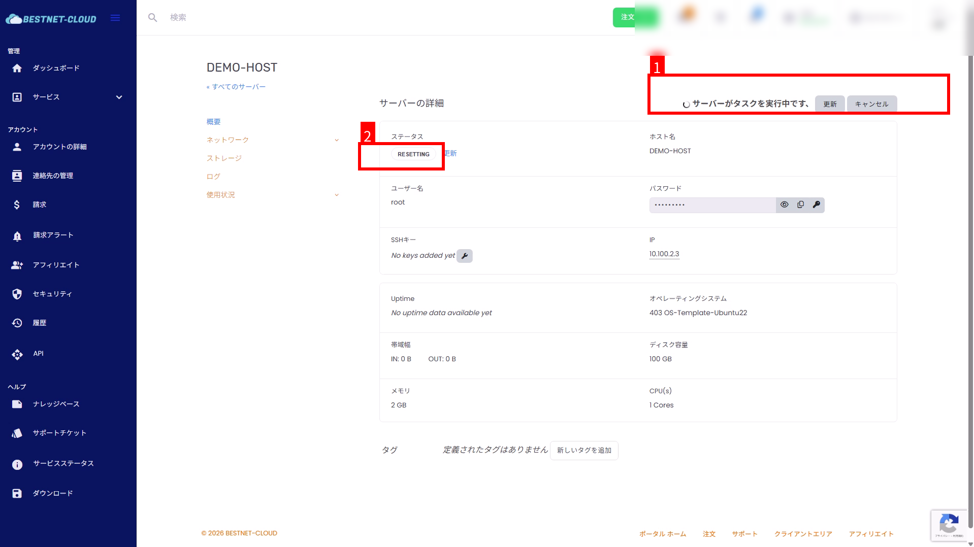 実行後、画面上部に「サーバーがタスクを実行中です」と表示され、ステータスが RESETTING になります。完了するまで待機してください。