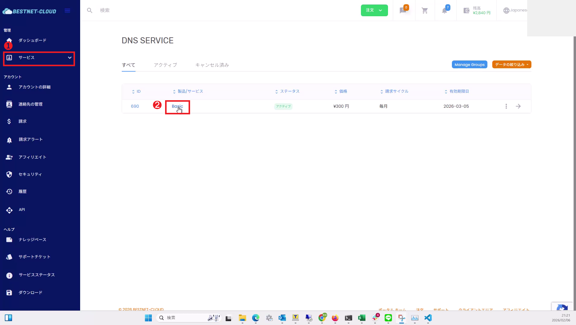 左メニューから サービスDNS SERVICE を開き、対象行のサービス名(例: Basic)をクリックして詳細画面へ進みます。