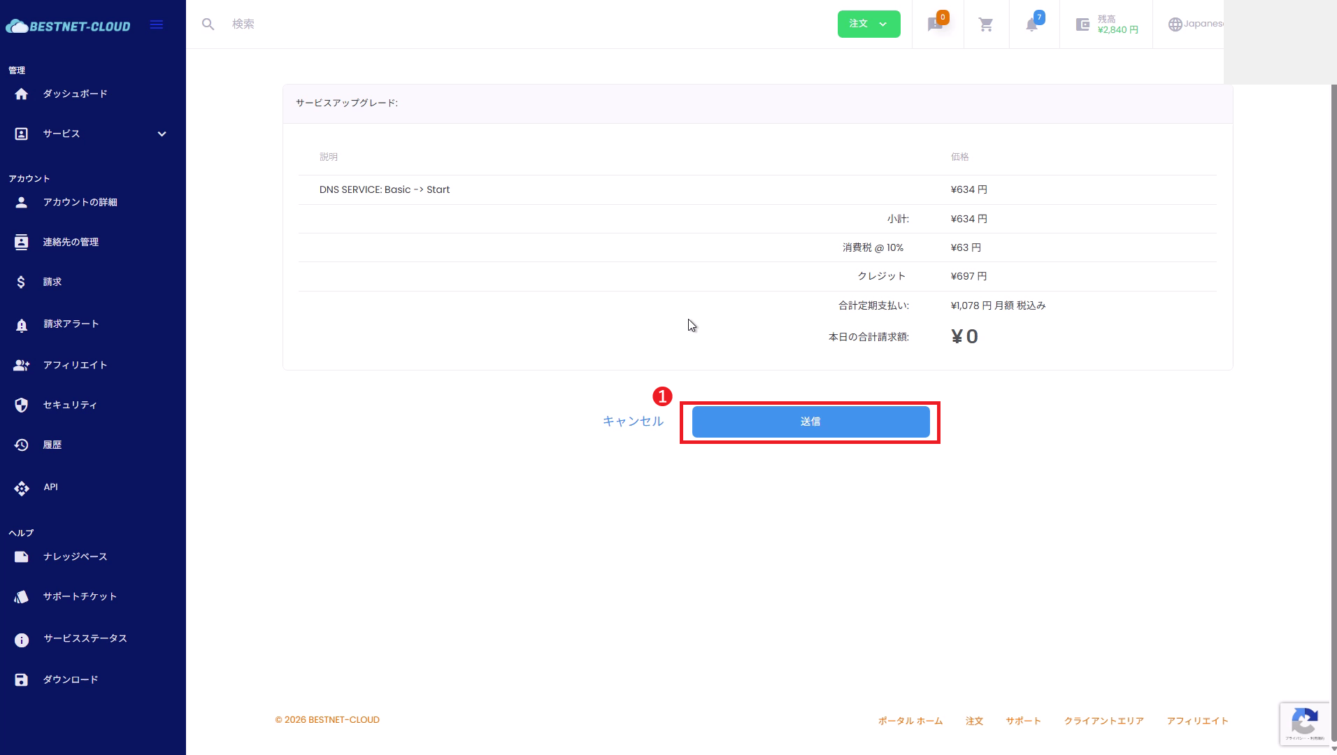アップグレード内容(変更前→変更後)と、本日の合計請求額 を確認します。問題なければ 「送信」 をクリックして確定します。