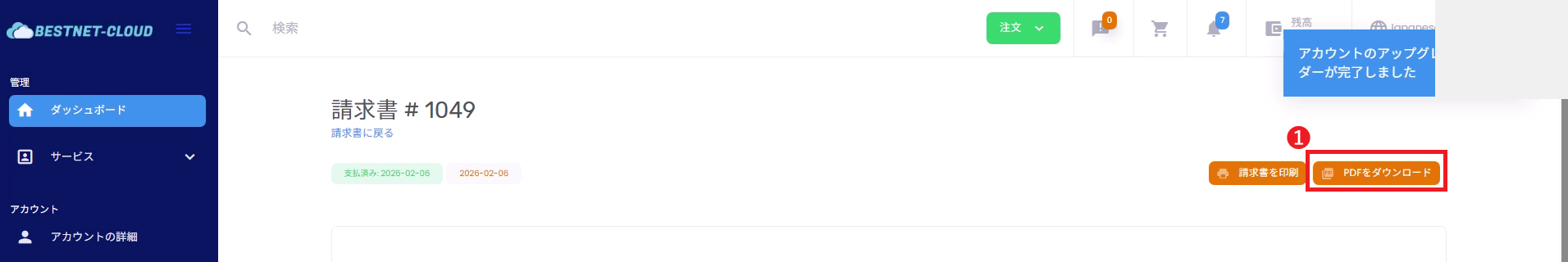 送信後、請求書画面が表示されます。必要に応じて 「PDFをダウンロード」 から控えを取得できます。