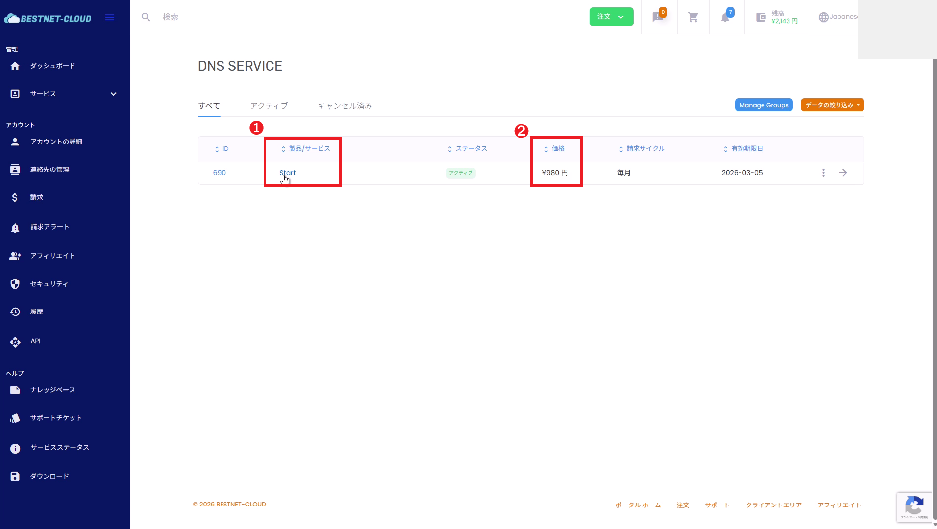 再度 サービスDNS SERVICE を開き、サービス名・価格が変更後の内容になっていることを確認します。