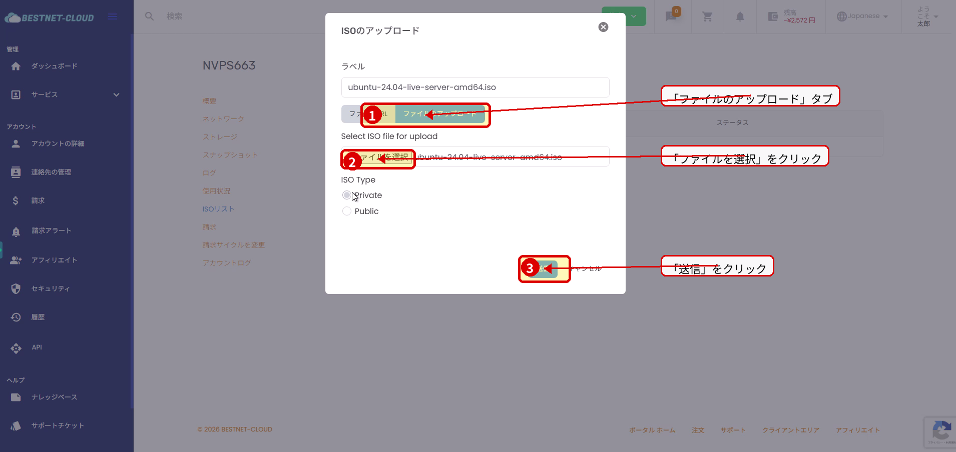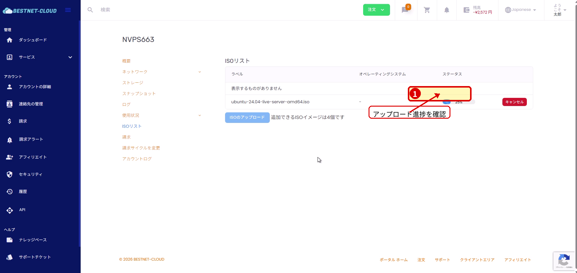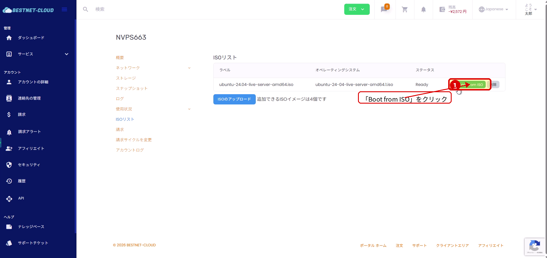 本手順書では、クライアントポータル上でISOイメージをアップロードし、VPSにISOをマウント(Boot from ISO)して起動するまでの流れを説明します。