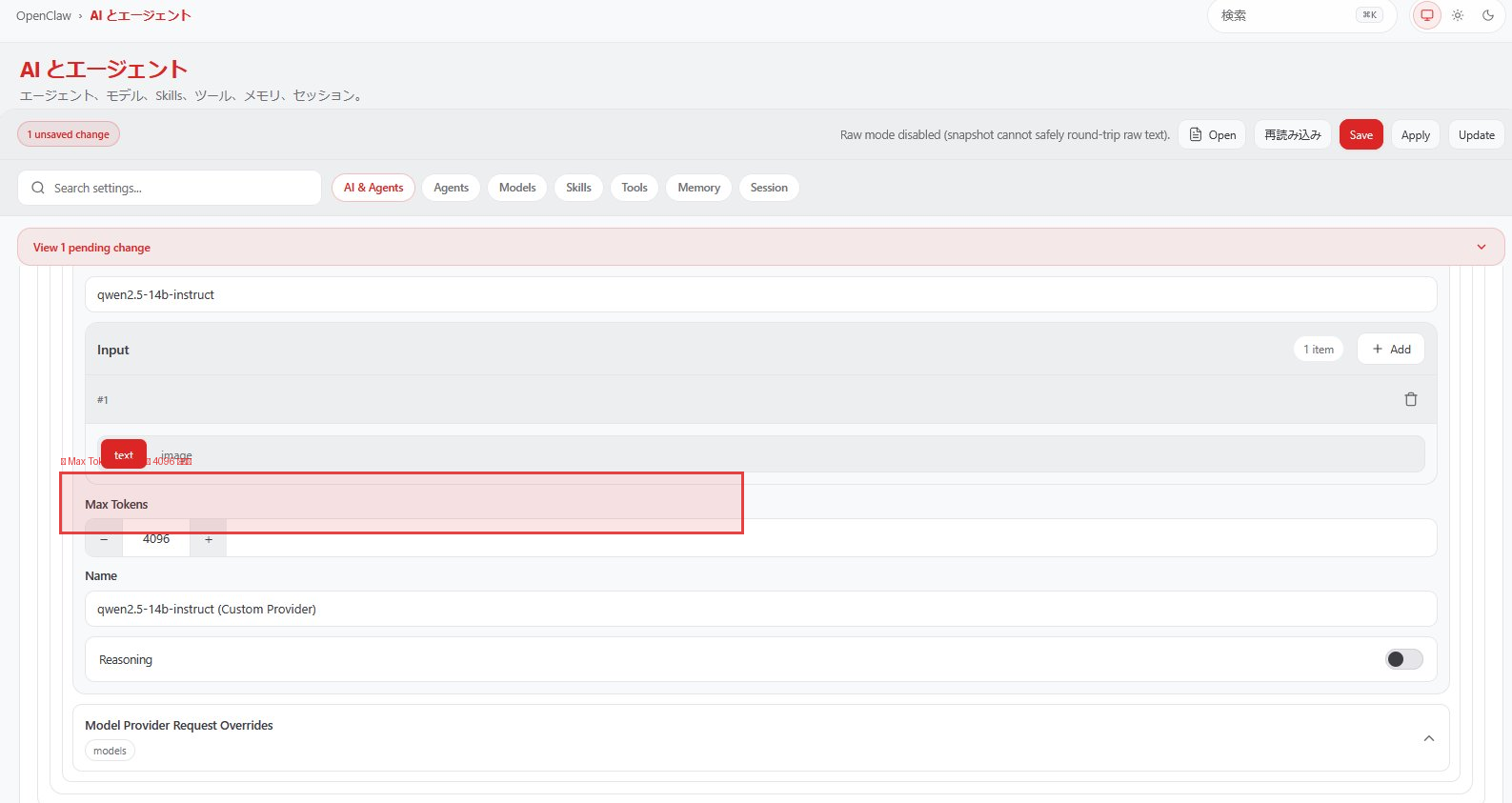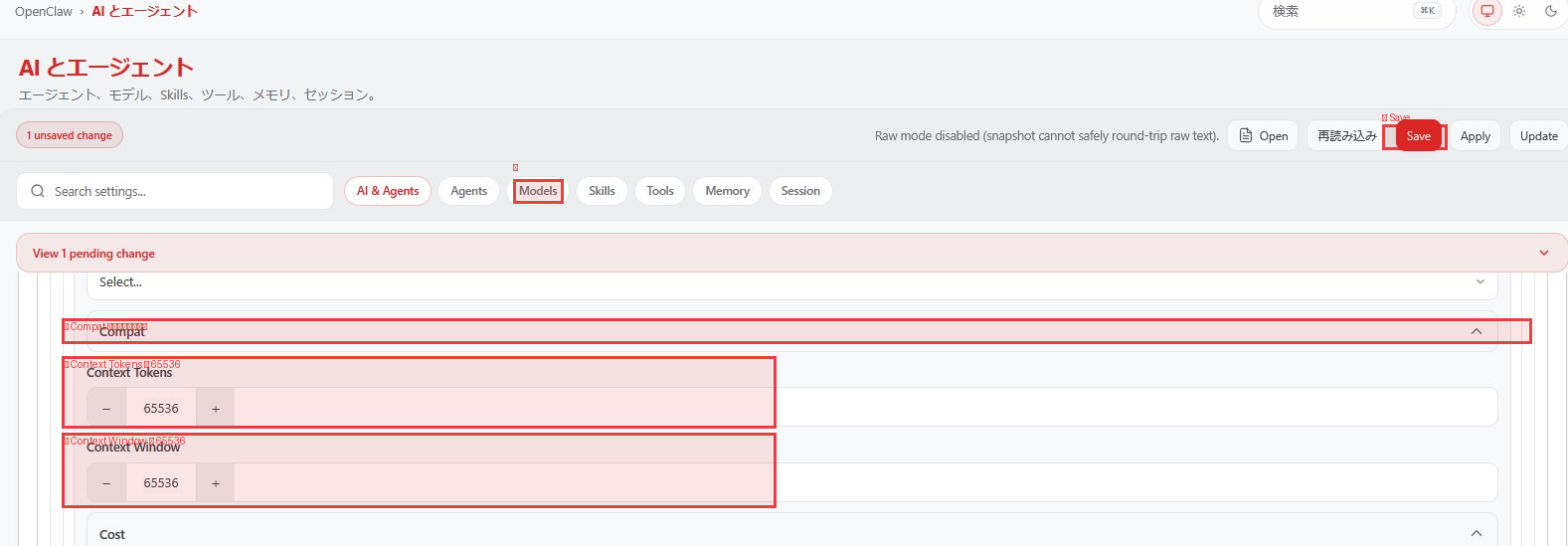 # compaction バッファを増やす openclaw config set agents.defaults.compaction.reserveTokensFloor 20000 # contextWindow を手動修正(プロバイダー名は環境に合わせて変更) python3 - << 'EOF' import json, os path = os.path.expanduser("~/.openclaw/openclaw.json") with open(path) as f: c = json.load(f) for k, v in c["models"]["providers"].items(): for m in v.get("models", []): m["contextWindow"] = 65536 m["maxTokens"] = 4096 with open(path, "w") as f: json.dump(c, f, indent=2, ensure_ascii=False) print("更新完了") EOF openclaw gateway restartUI から設定する方が確実です