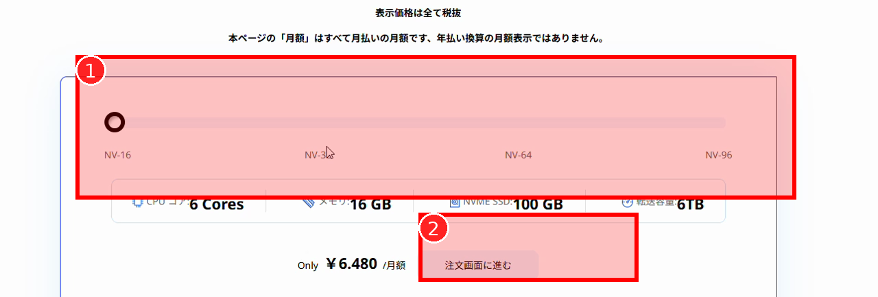 2. スライダー(例:NV-16 / NV-32 / NV-64 / NV-96)から希望プランを選択します。