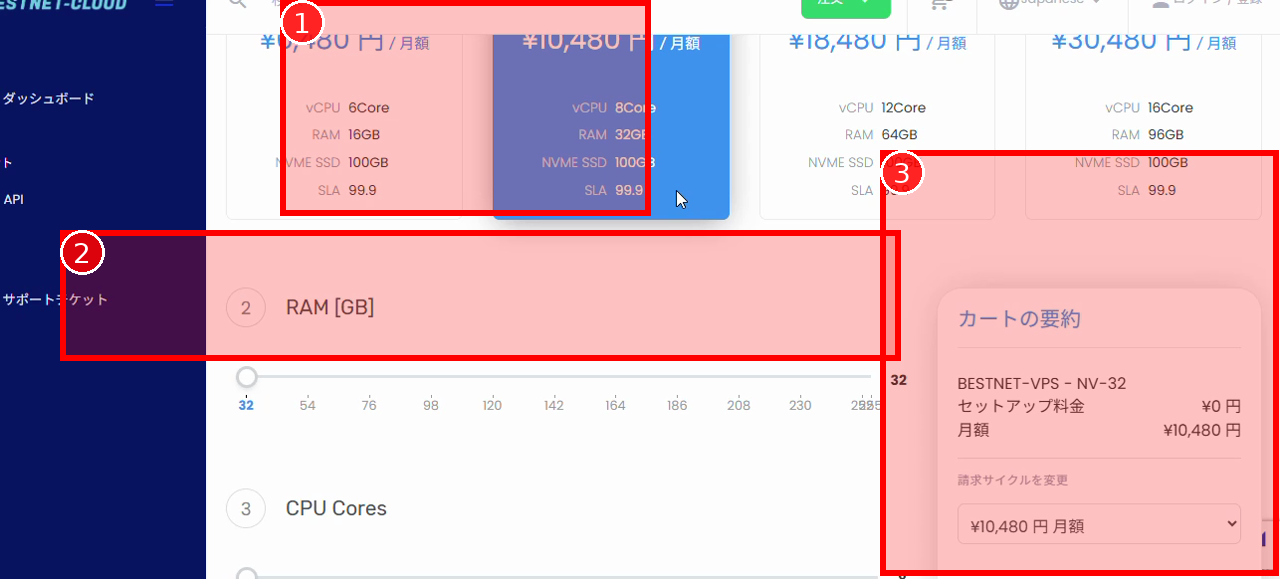 3. 表示されるスペック(CPU/メモリ/NVMe SSD/転送容量)と月額料金を確認します。